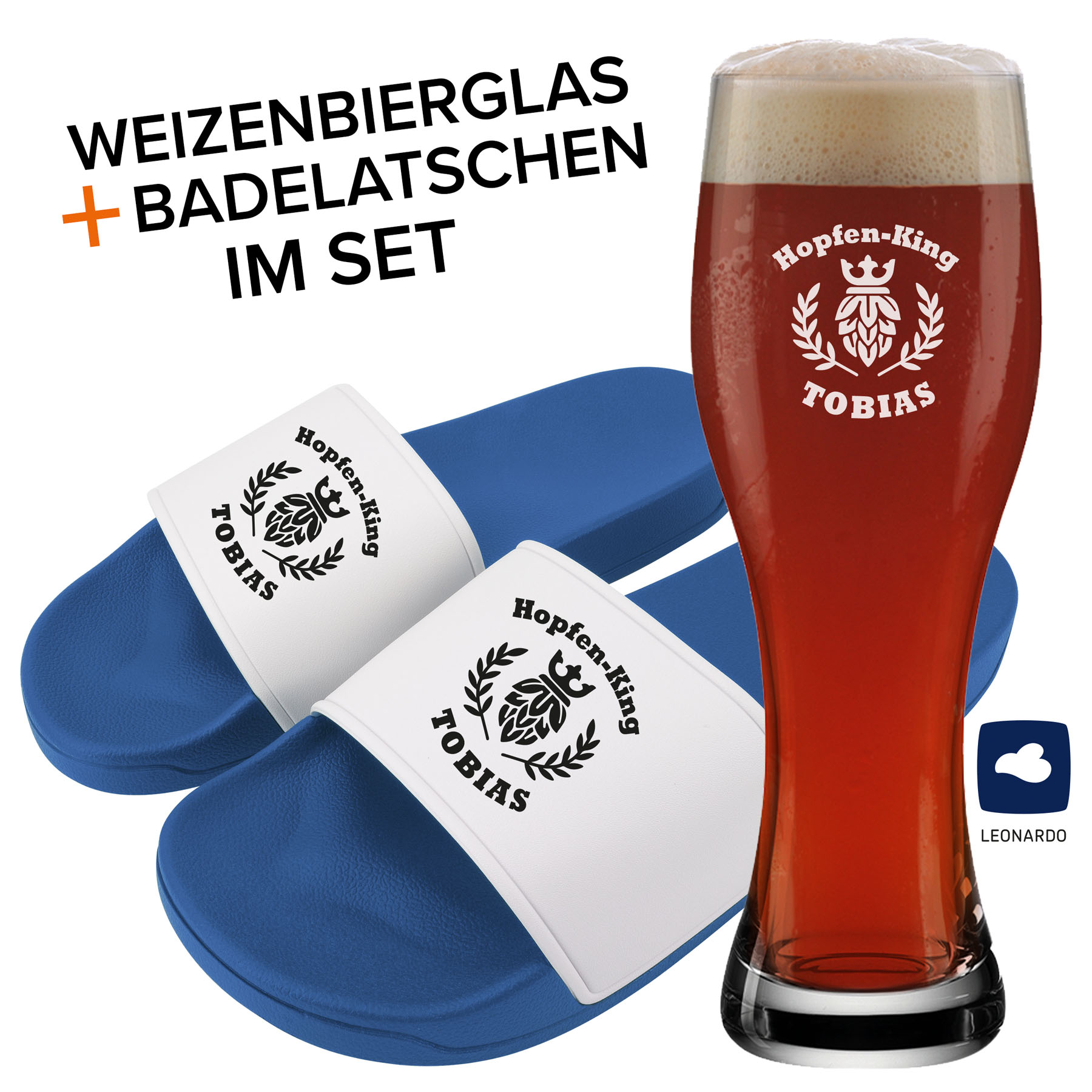 <p>Mit unserem exklusiven Hopfen King Set bekommst du nicht nur stylische Badelatschen, sondern auch ein hochwertiges Leonardo Weizenglas. Perfekt für entspannte Abende oder gesellige Runden mit Freunden. Du kannst dein Set sogar mit deinem Namen oder Wunschtext personalisieren, sodass es zu einem einzigartigen Unikat wird. Ein Must-Have für jeden Bierliebhaber!</p>
