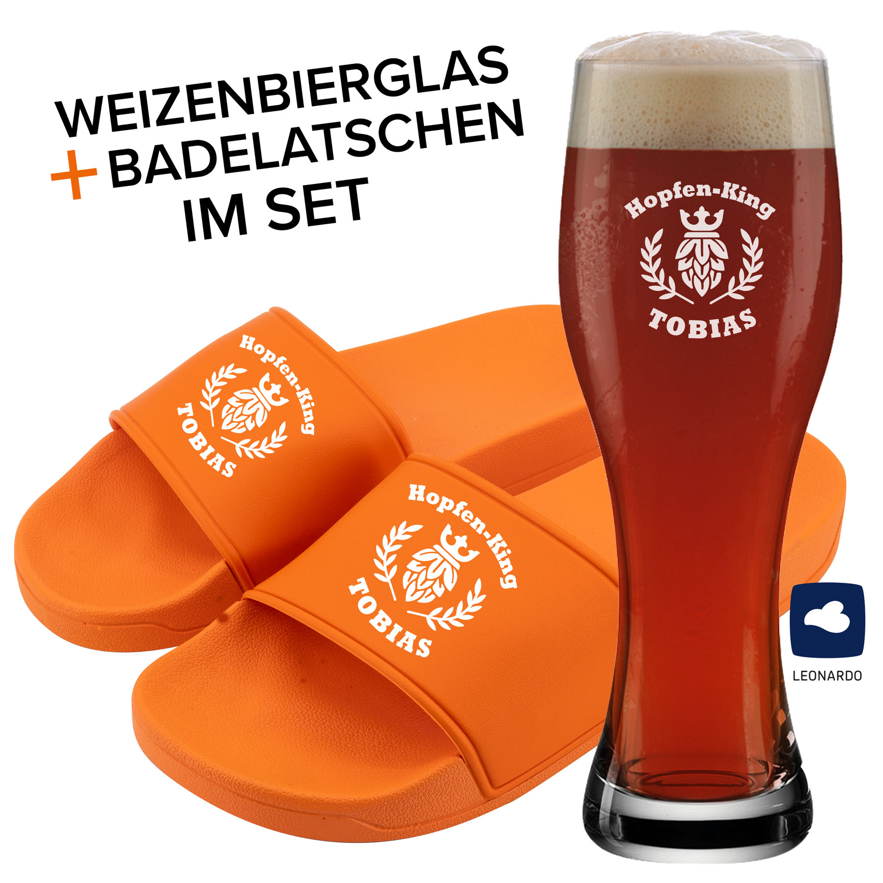 Badelatschen und Weizenglas "Hopfen King" mit Name oder Wunschtext
