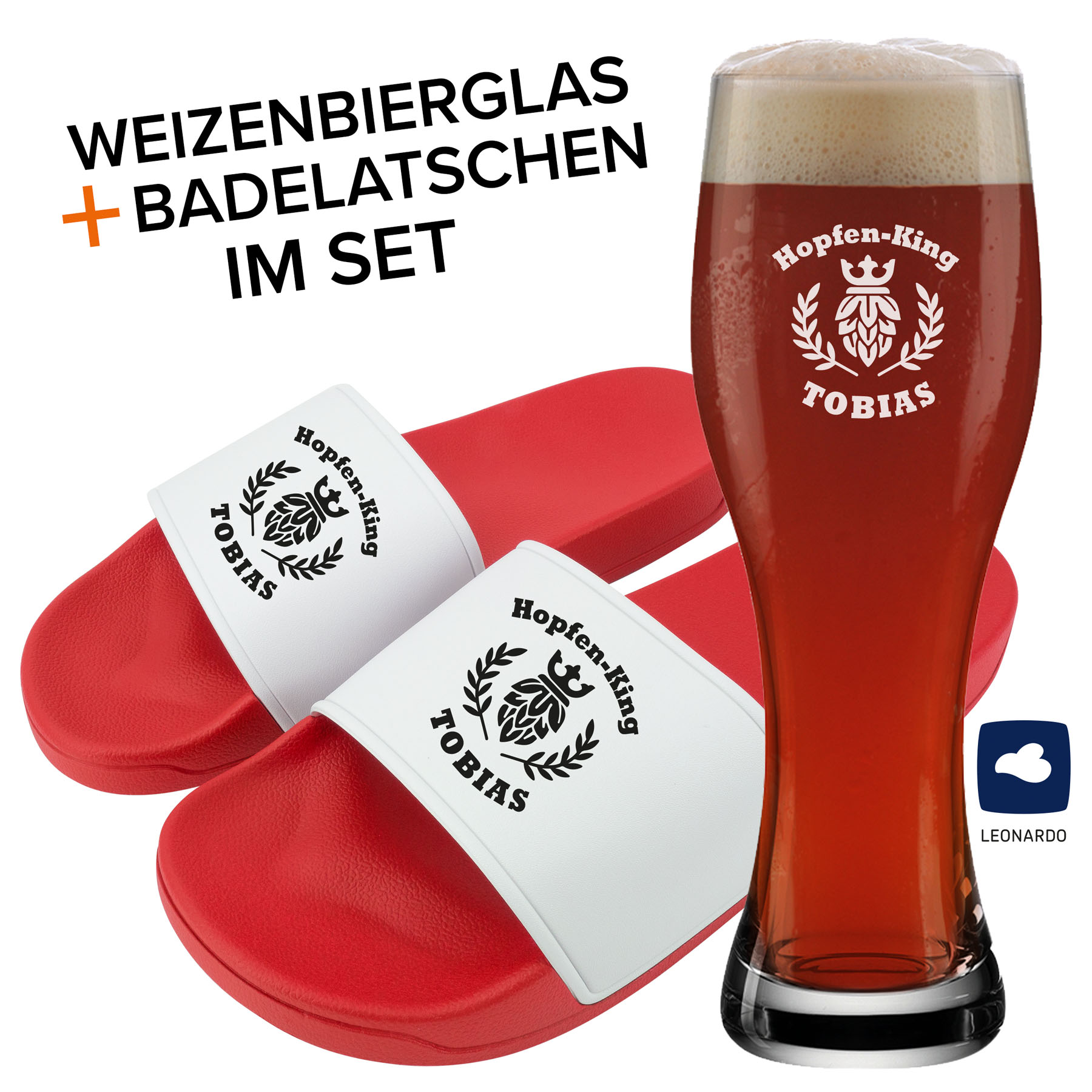 Badelatschen und Weizenglas "Hopfen King" mit Name oder Wunschtext