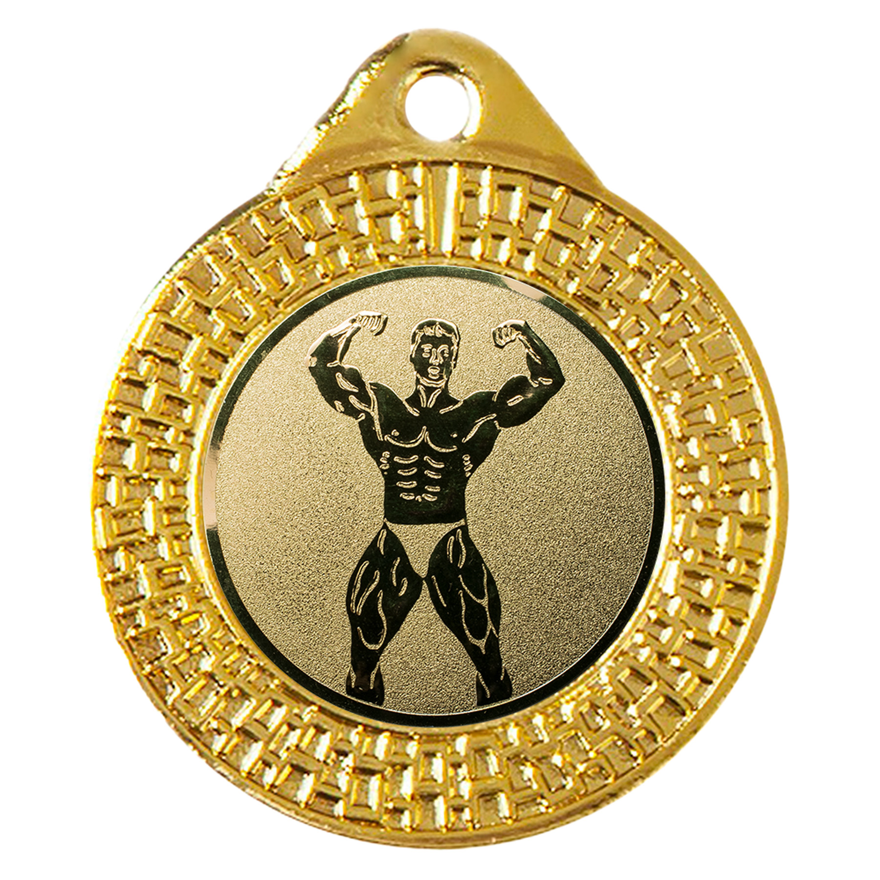 Im Mittelpunkt der Medaille befindet sich ein 25 mm großes Emblem, das ein thematisch passendes Bodybuilding-Motiv zeigt. Du kannst zwischen Gold, Silber oder Bronze wählen – ideal zur Differenzierung der Platzierungen oder verschiedener Kategorien. Das Emblem ist bereits montiert und verleiht der Medaille ein professionelles Erscheinungsbild.