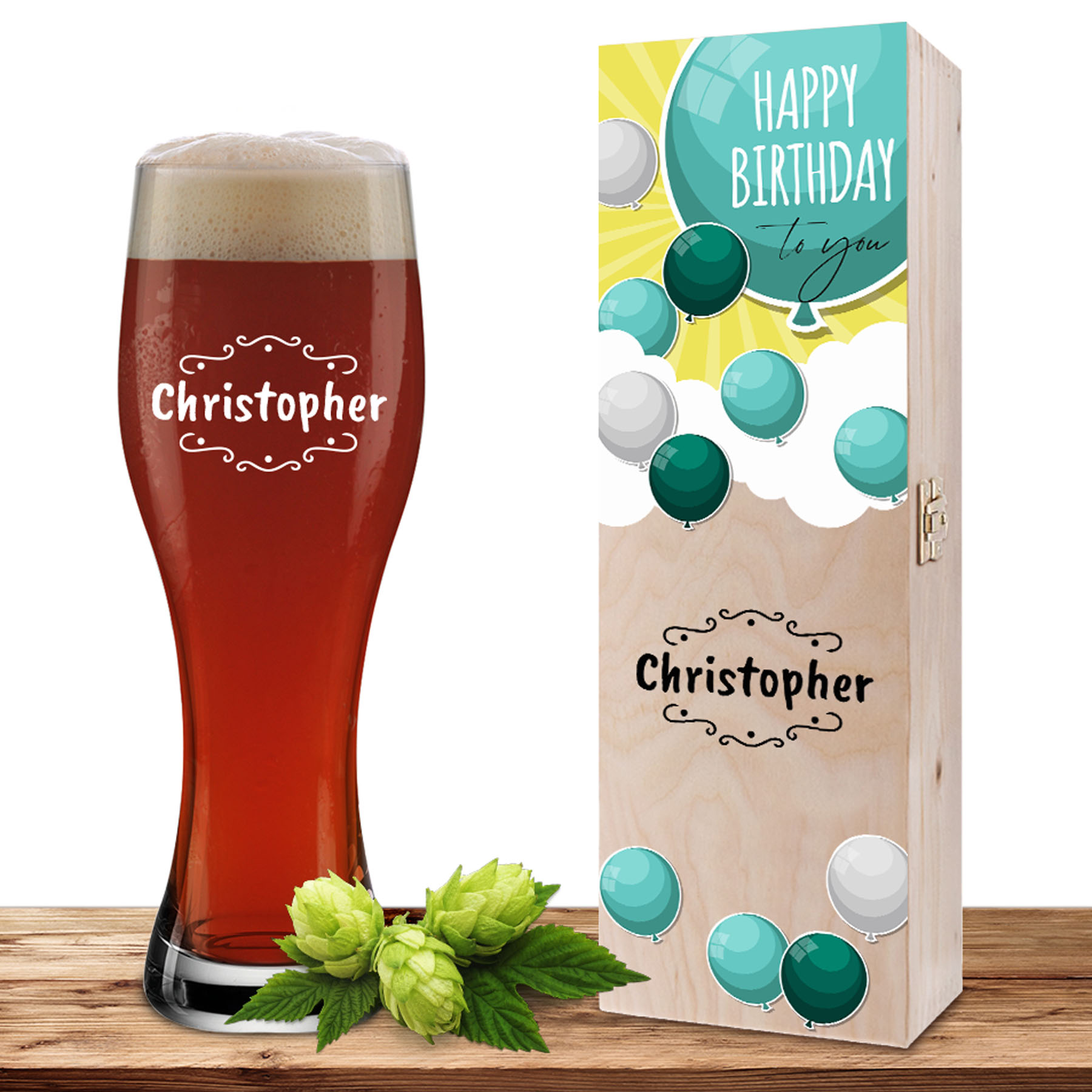 Personalisiertes Weizenglas-Holzkiste-Set mit Gravur und Bedruckung „Ballons Verzierung 02“