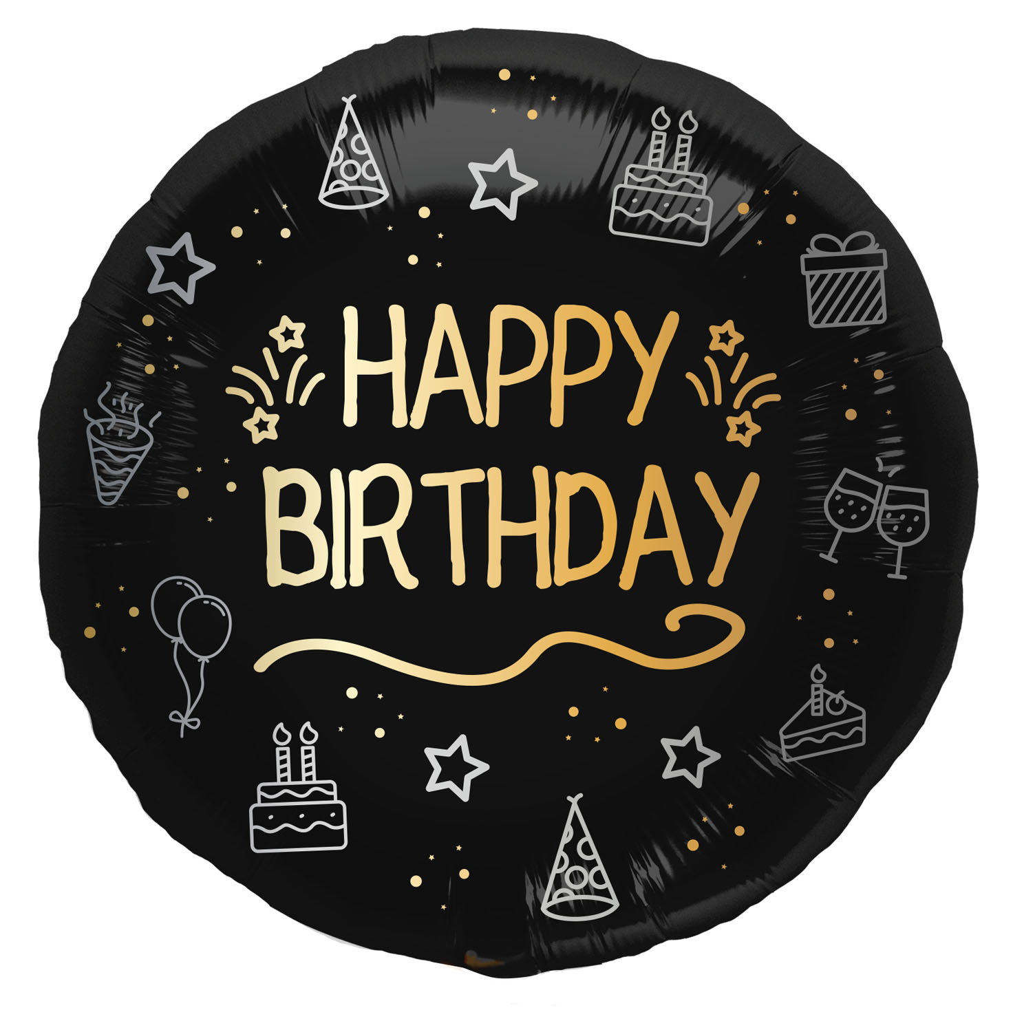 Ein echter Partyklassiker mit Glamour-Faktor – der Folienballon „Happy Birthday“ sorgt für eine festliche Atmosphäre auf jeder Geburtstagsfeier. Das elegante Design in Schwarz mit glänzenden Gold- und Silberdetails passt zu Geburtstagen jeden Alters.