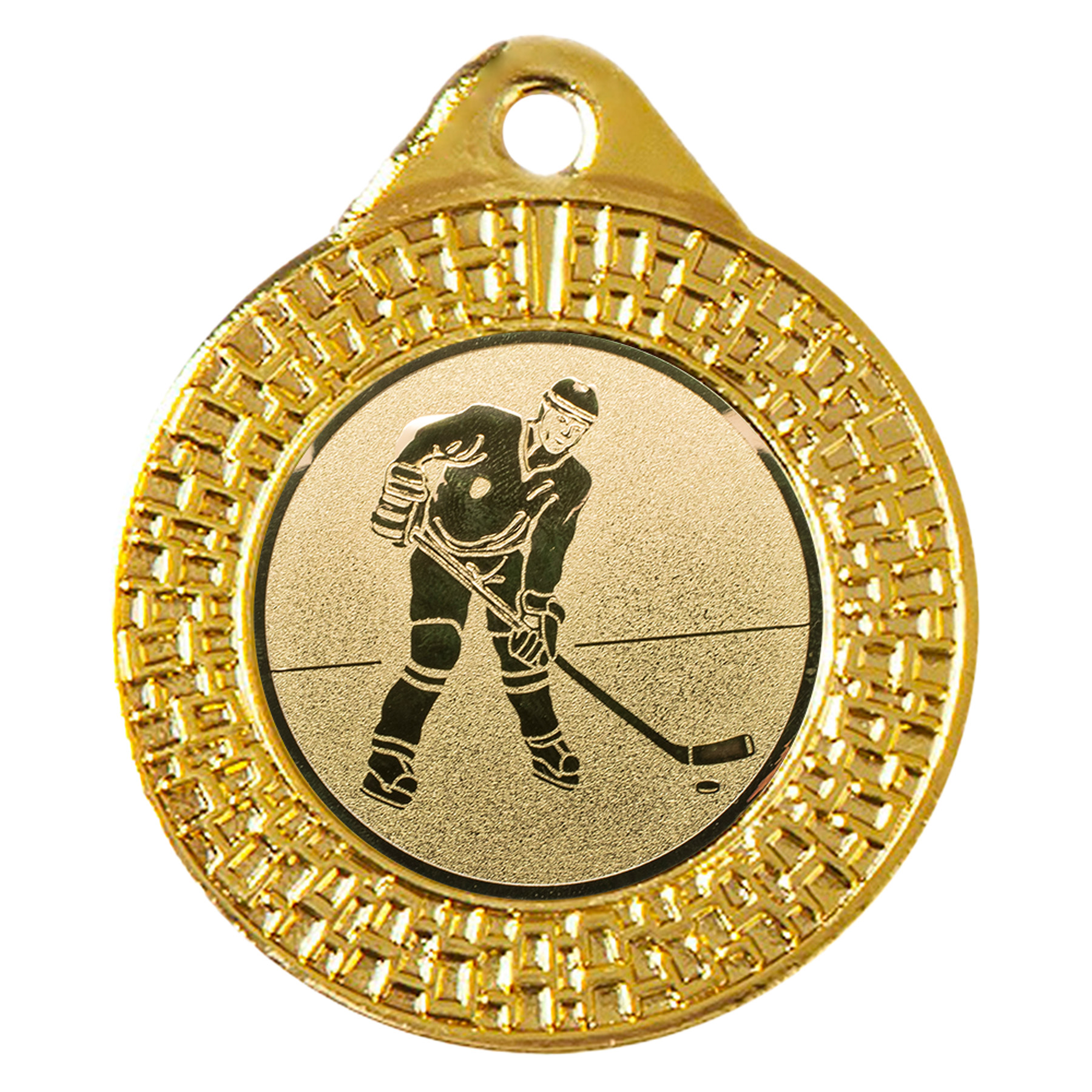 Im Zentrum der Medaille befindet sich ein 25 mm großes Eishockey-Emblem. Dieses ist in den drei gängigen Platzierungsfarben Gold, Silber und Bronze erhältlich und bereits vormontiert. Damit wird die Medaille zur idealen Auszeichnung für 1. bis 3. Plätze und lässt sich auch bei Turnierserien optimal einsetzen.