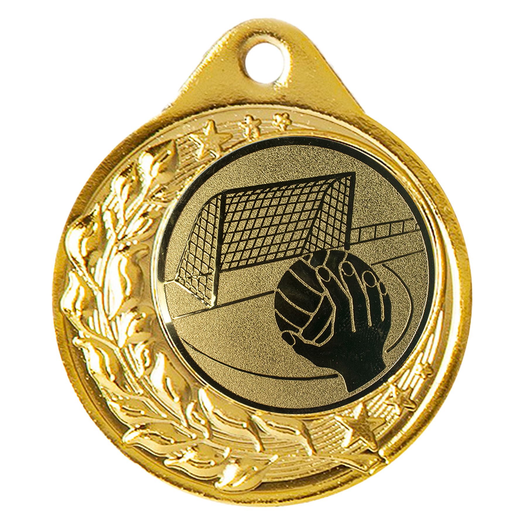Im Mittelpunkt der Medaille befindet sich ein 25 mm großes Emblem mit Handball-Motiv. Es steht in Gold, Silber oder Bronze zur Auswahl – passend zur jeweiligen Platzierung. Das Emblem ist bereits fest in die Medaille montiert und somit direkt einsatzbereit für Siegerehrungen.
