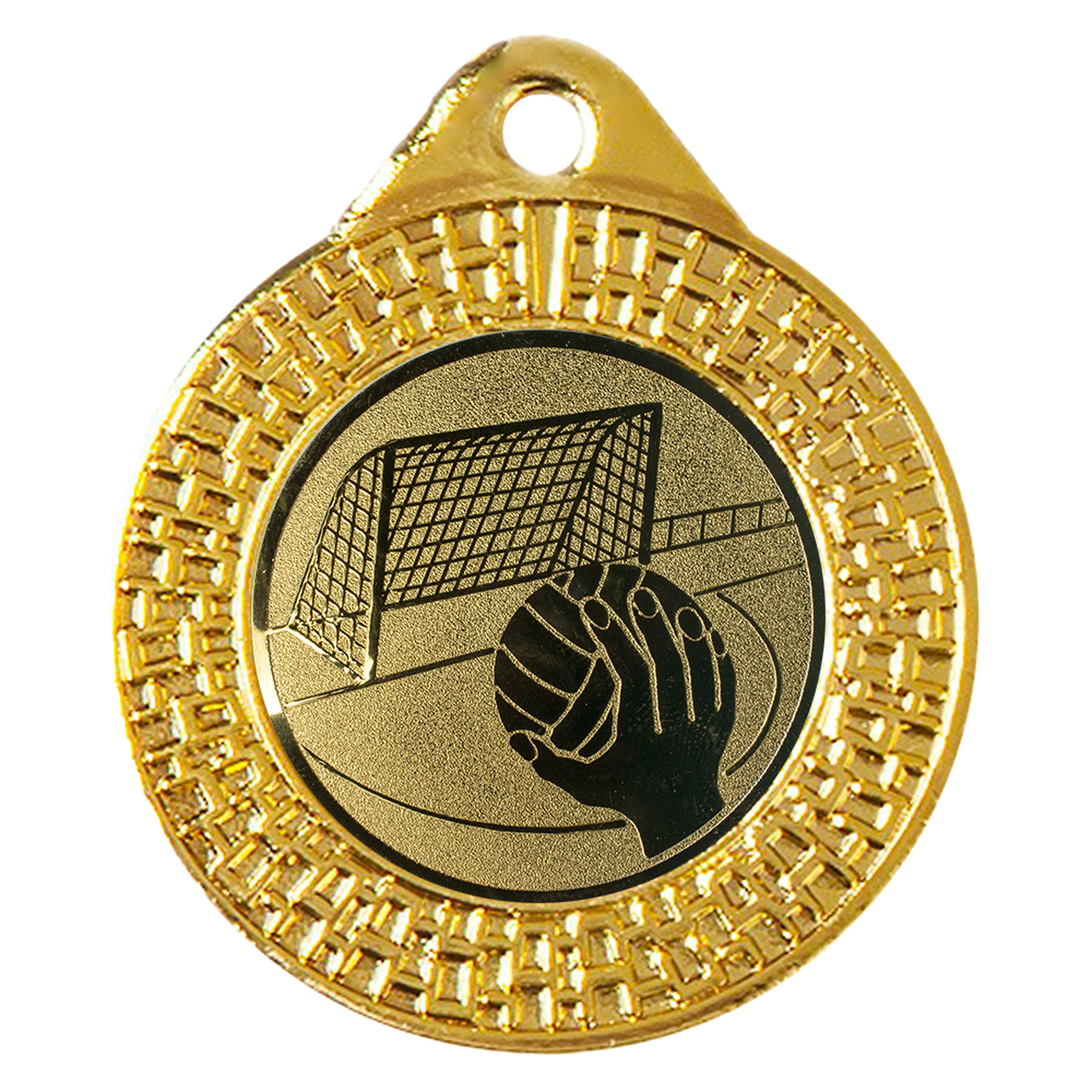 Im Mittelpunkt der Medaille befindet sich ein 25 mm großes Emblem mit Handball-Motiv. Es steht in Gold, Silber oder Bronze zur Auswahl – passend zur jeweiligen Platzierung. Das Emblem ist bereits fest in die Medaille montiert und somit direkt einsatzbereit für Siegerehrungen.