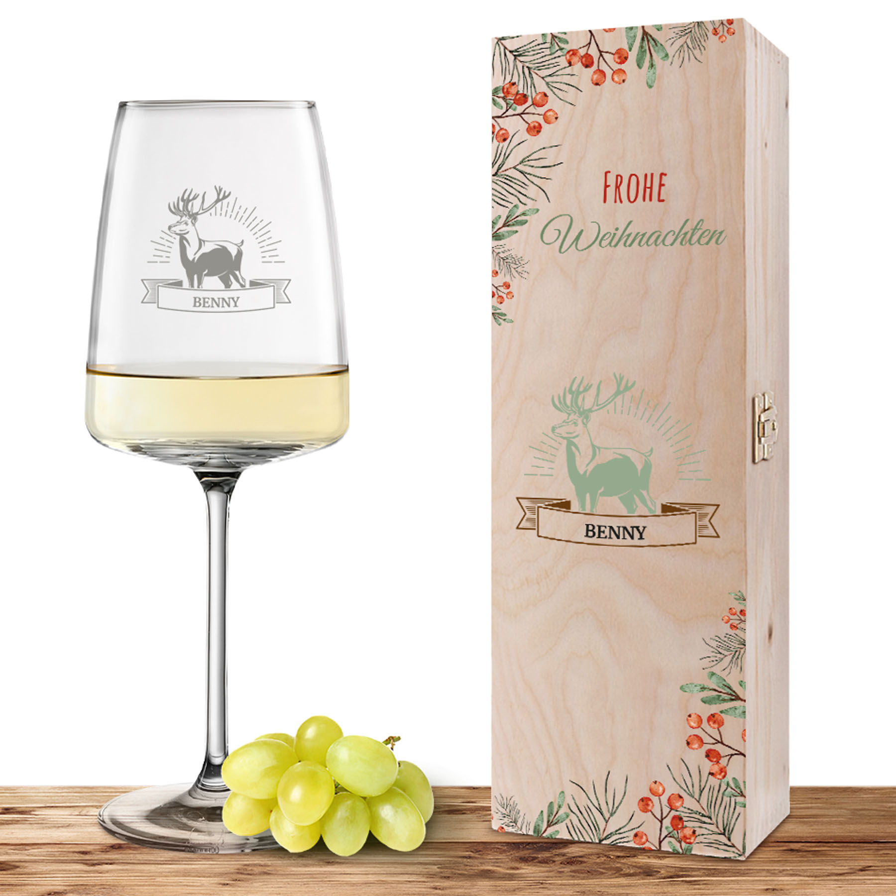 Personalisiertes Weinglas-Holzkiste-Set mit Gravur und Bedruckung "Hirsch"