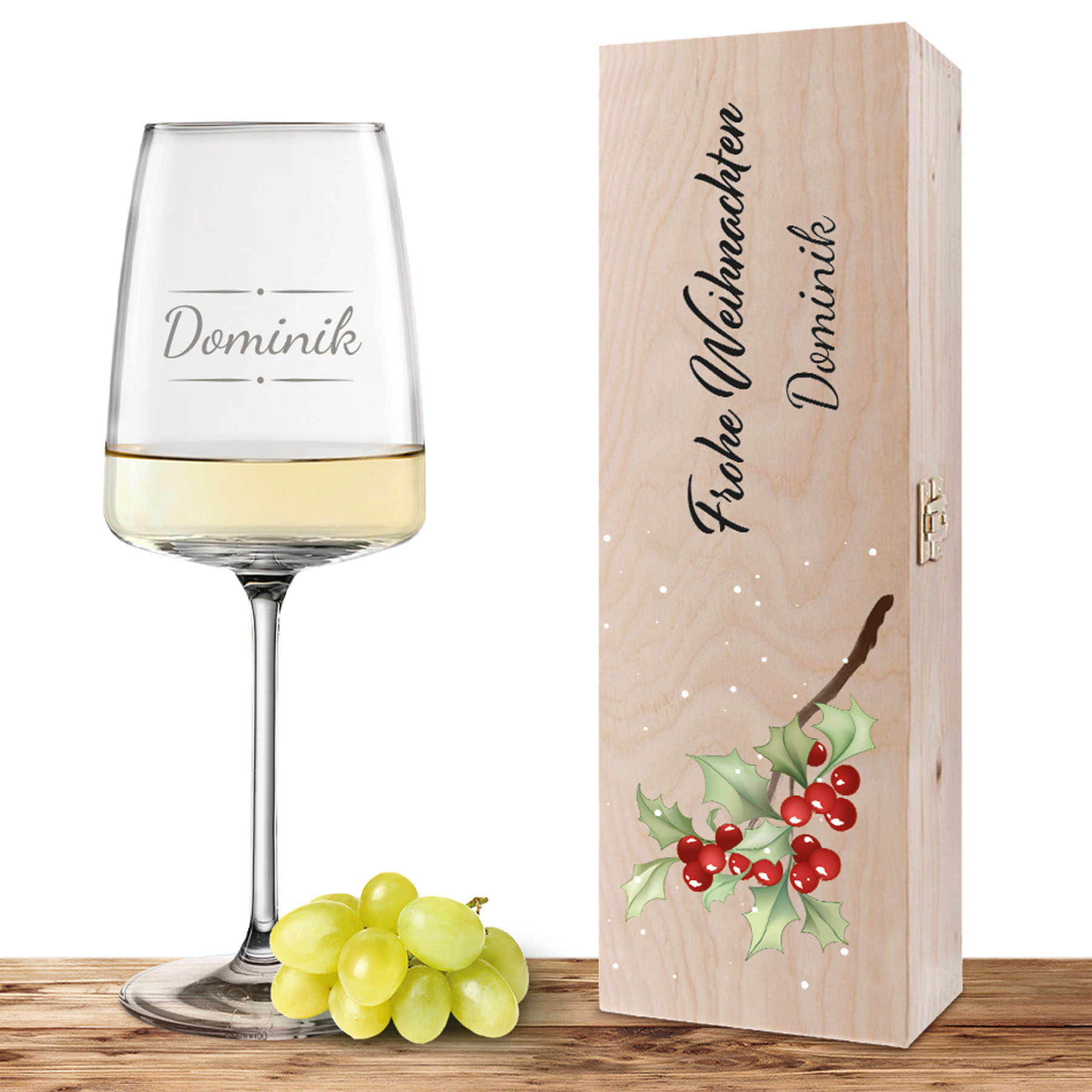 Die passende Holzkiste besteht aus echtem Holz und ist mit einem praktischen Scharnierdeckel und Schloss ausgestattet. Die Kiste wird mit einem UV-Druck versehen, der das Motiv des Mistelzweigs und denselben Text wie auf dem Glas zeigt. So entsteht ein harmonisches Gesamtbild. Die Holzkiste ist mit Holzwolle gefüllt, die das Glas sicher vor Bruch und Staub schützt.