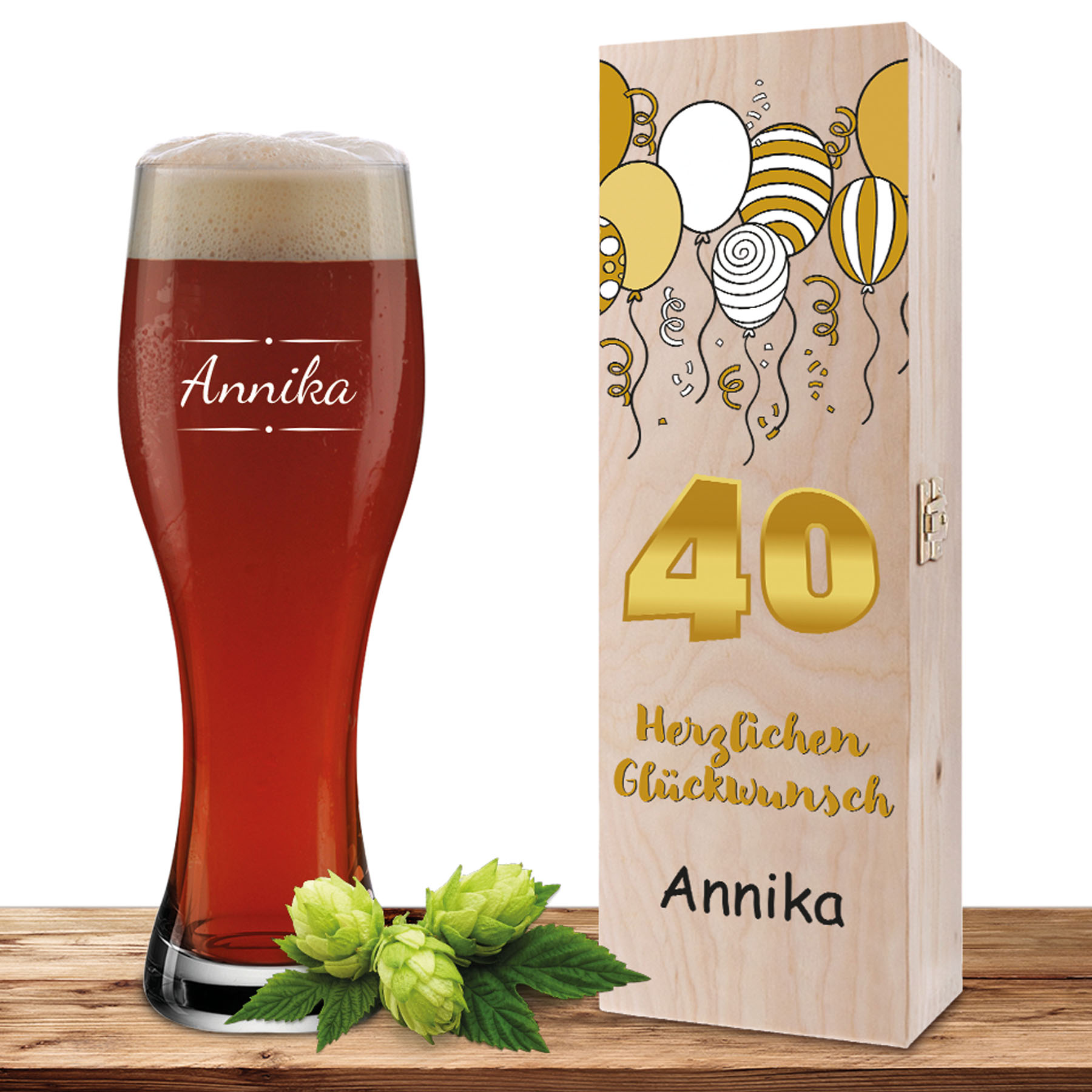 Das Weizenglas wird präzise per Lasergravur mit einem Namen veredelt. Die Gravur ist dauerhaft, abriebfest und sorgt für eine elegante Optik. Die passende Holzkiste greift das Design stilvoll auf: Auf der Holzbox befindet sich das Motiv mit der Zahl 40, darunter der Schriftzug „Herzlichen Glückwunsch“ und darunter exakt derselbe Name wie auf dem Glas. So entsteht ein harmonisches Gesamtbild, das perfekt aufeinander abgestimmt ist.