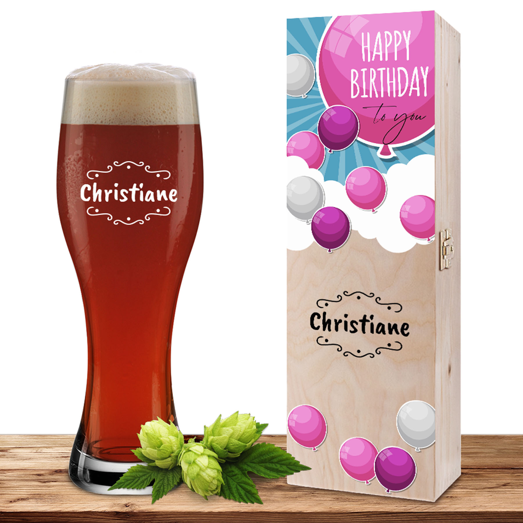 Das Weizenglas wird mit dem gewünschten Namen präzise per Lasergravur veredelt. Dadurch entsteht eine dauerhafte, elegante Personalisierung, die auch nach vielen Spülgängen erhalten bleibt. Die Holzkiste greift das Design harmonisch auf: Ballons mit dem Schriftzug „Happy Birthday to you“ und darunter derselbe Name wie auf dem Glas sorgen für ein stimmiges Gesamtbild. Das Motiv wird per UV-Druck in leuchtenden Farben aufgebracht und überzeugt durch hohe Farbbrillanz.