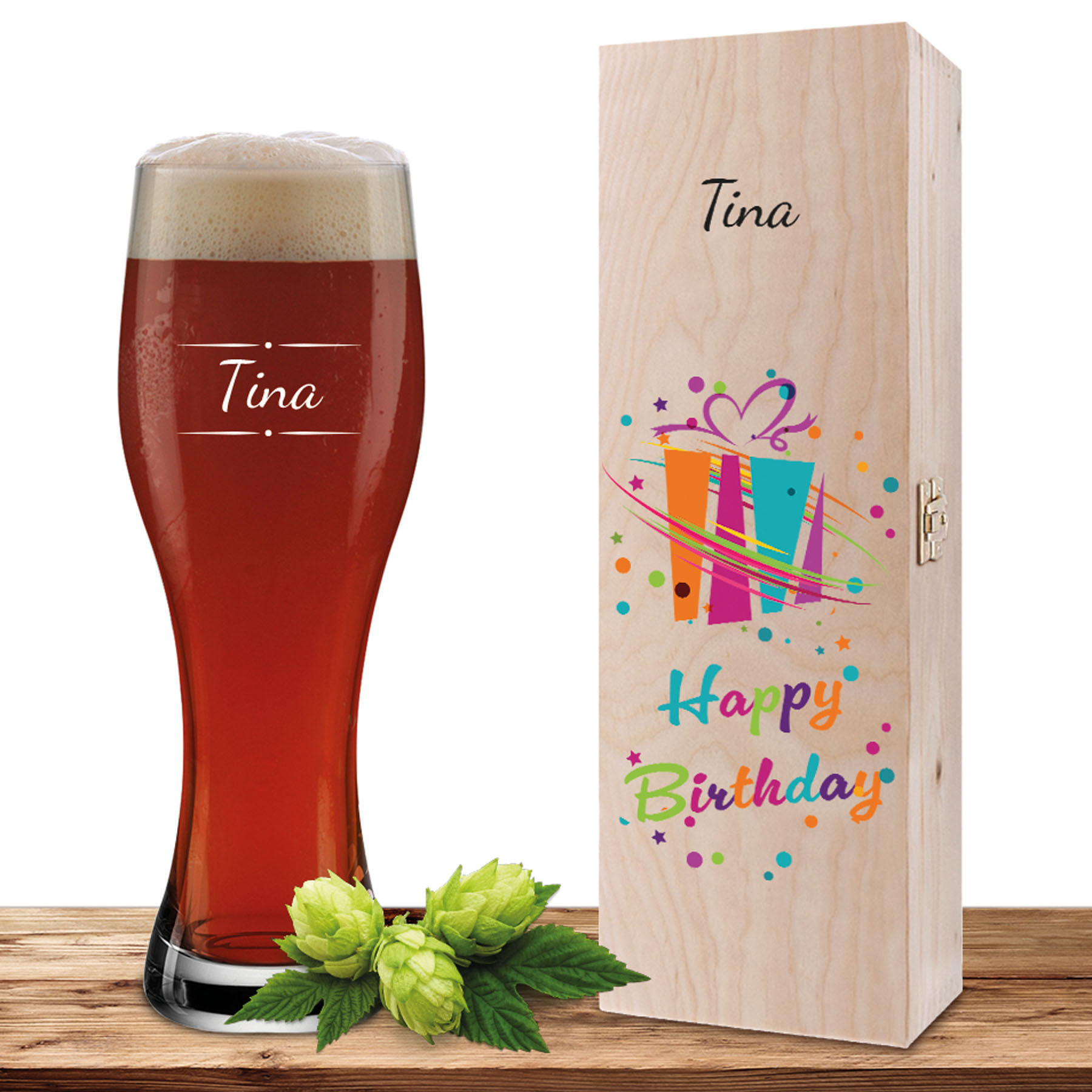 Dieses personalisierte Weizenglas-Holzkiste-Set mit Gravur und Bedruckung „Geschenk“ vereint stilvollen Biergenuss mit einer hochwertigen Präsentation. Du erhältst ein edles Set, das durch Individualität, Qualität und Design überzeugt. Der gleiche Name auf Glas und Holzbox sorgt für eine harmonische Optik, während der Schriftzug Happy Birthday das Set zu einem besonderen Geburtstagsgeschenk macht. Durch die persönliche Gravur wird aus einem klassischen Weizenglas ein einzigartiges Erinnerungsstück mit emotionalem Wert.