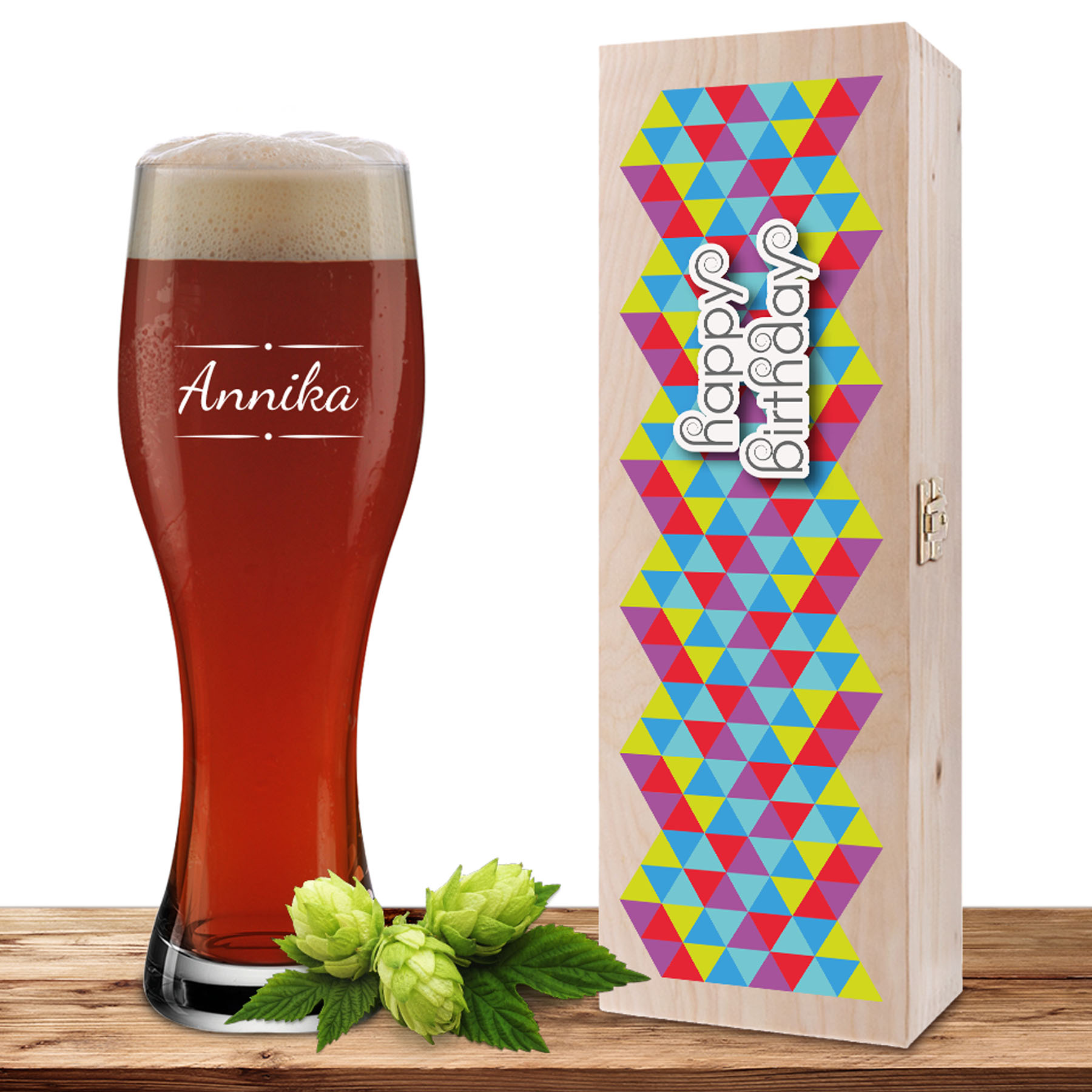 Personalisiertes Weizenglas-Holzkiste-Set mit Gravur und Bedruckung "Happy Birthday Verzierung 03"