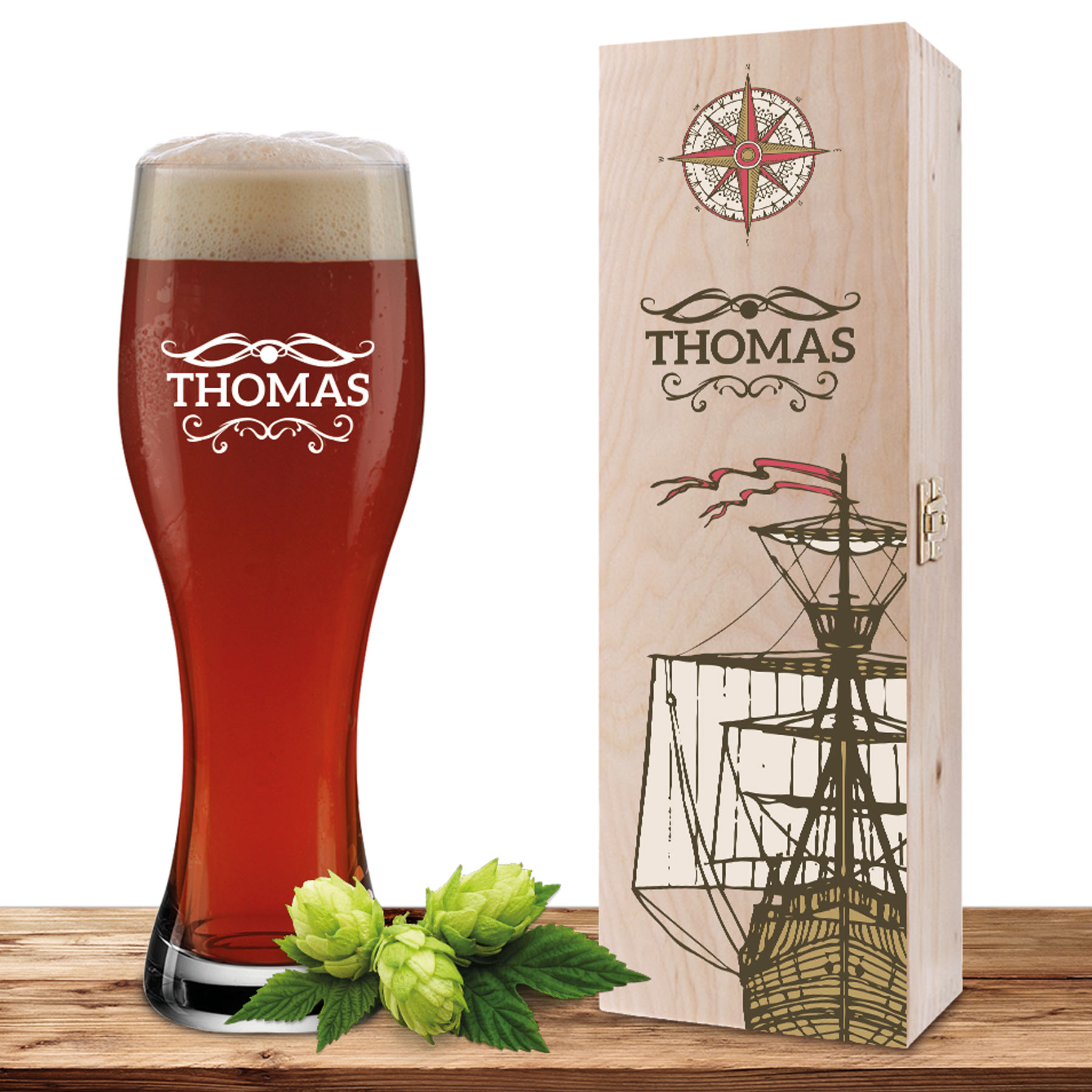 Personalisiertes Weizenglas-Holzkiste-Set mit Gravur und Bedruckung Maritim „Barock 01“